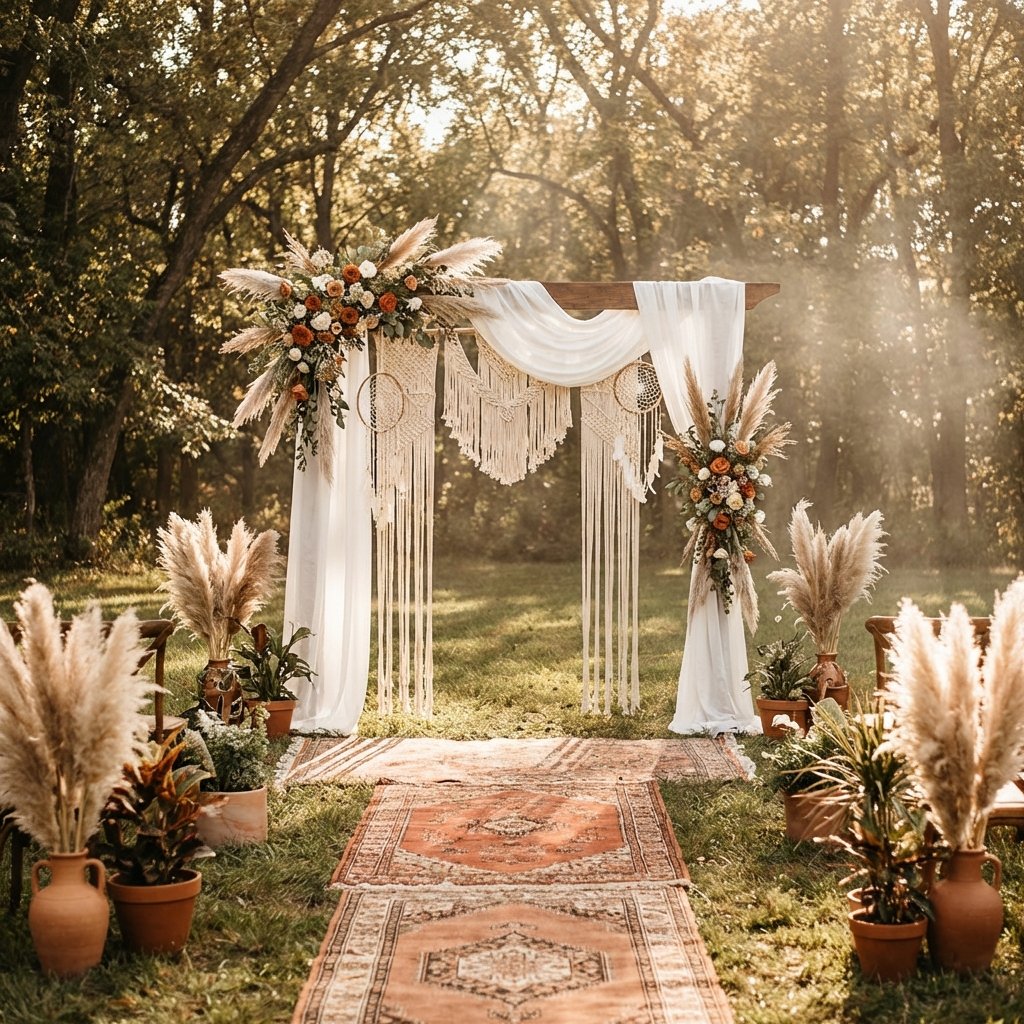 The centerpiece of any boho ceremony is often a stunning macrame backdrop. In 2026, we're seeing larger, more intricate designs that create a dramatic focal point for your vows.